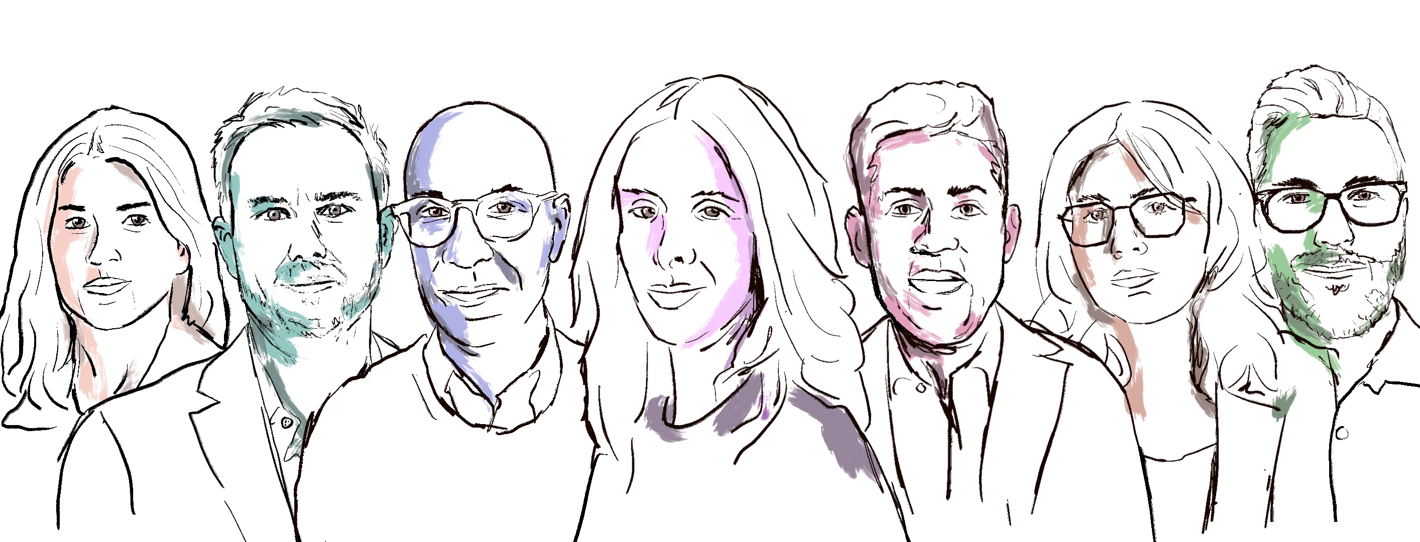 The full Weekend team (from left): reporters Julia Black and Josh Koehn; The Information's Features Editor Nick Wingfield and Editor in Chief Jessica Lessin; Weekend editor Abe Brown; reporter Paris Martineau; and art director Clark Miller, who made this illustration.
